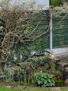 Sitting in my ‘morning chair’ with my notebook, I settle myself, looking at my pond, the wisteria beginning to bloom, the iris’s green blade leaves rising from the water, the grey squirrel climbing down the plaited, twists of the trunk, a quick drink of water, a scramble up the branch, flurry of tail and he’s gone …